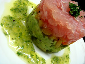 【まぐろとアボカドのタルタルとバケットとフォアグラパテの前菜】