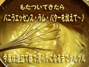 ③だまが無くなった①のボールに温まった牛乳を少しずつ入れ混ぜたら